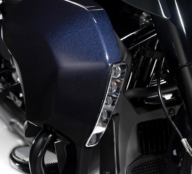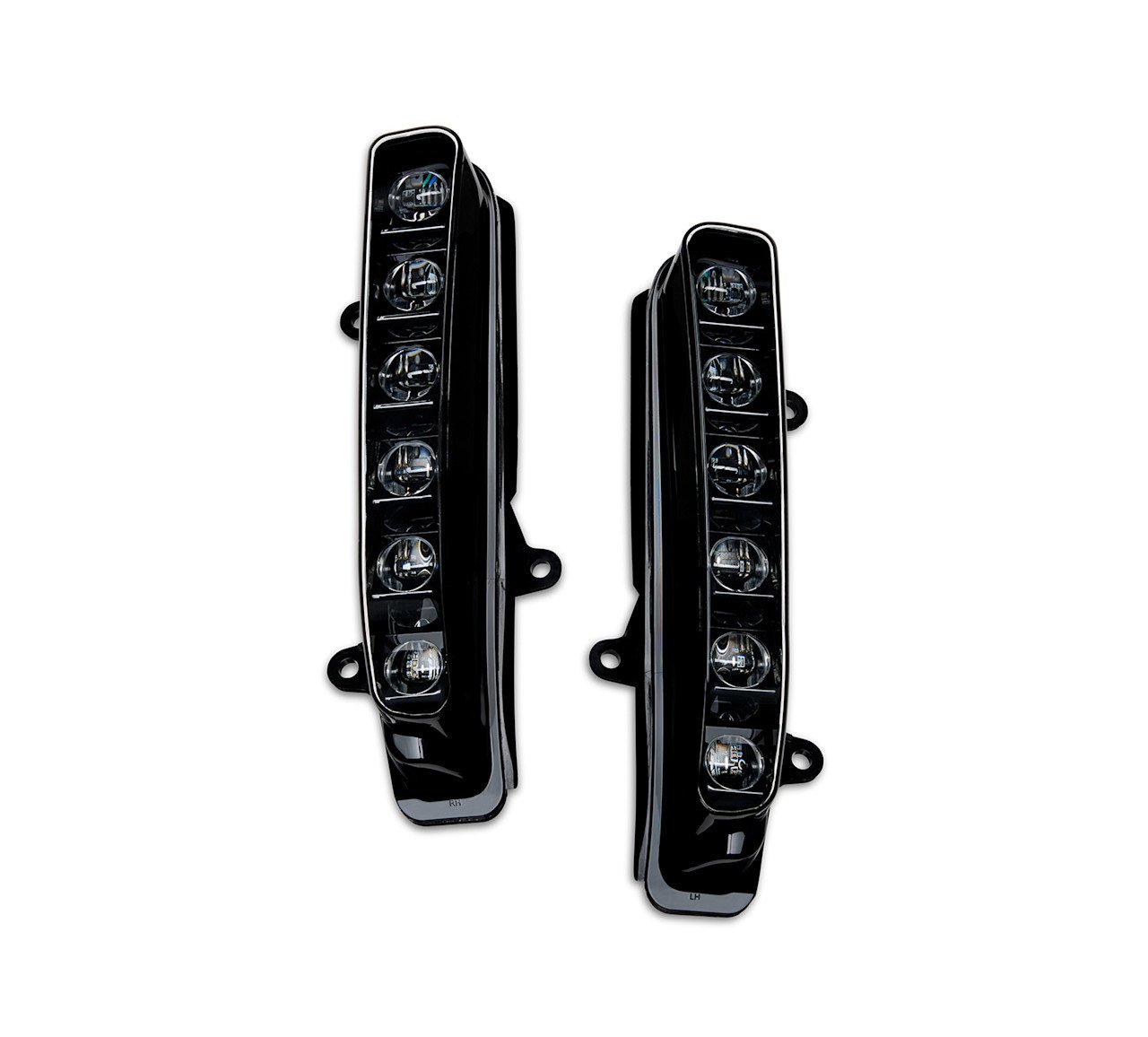 Long-life solid-state and low-draw LED lamps are sealed in shock and vibration-resistant housings that mount within the Engine Guard Lowers for a clean custom appearance