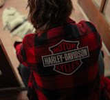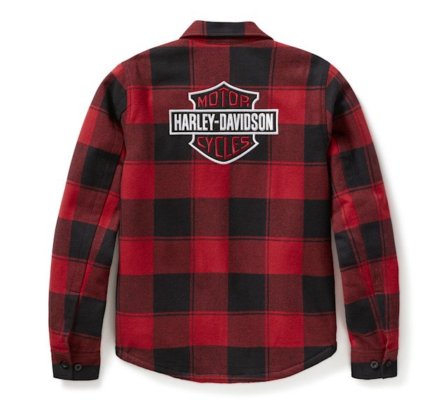 Your stay-warm style goes the distance in our H-D® Buffalo Check Shirt Jacket. This women’s outerwear is made rugged from heavyweight cotton twill with a cozy polyester Sherpa lining. It features ample pocket space for stashing essentials and a hidden snap-down collar that won’t flap around under riding gear. Its classic buffalo plaid pattern is the perfect backdrop for our graphics that hit the front and fill the back.